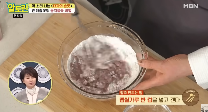 탱글탱글한 새알심은 알토란 김하진 동지팥죽의 매력을 한층 더해줍니다. 시판 찹쌀가루 200g에 뜨거운 물 10큰술과 소금 1작은술을 넣고 반죽합니다. 이때 물은 한꺼번에 붓지 말고 조금씩 조절하여 반죽의 질기를 조정해야 합니다. 완성된 반죽은 적당한 크기로 동글동글 빚어 준비합니다.