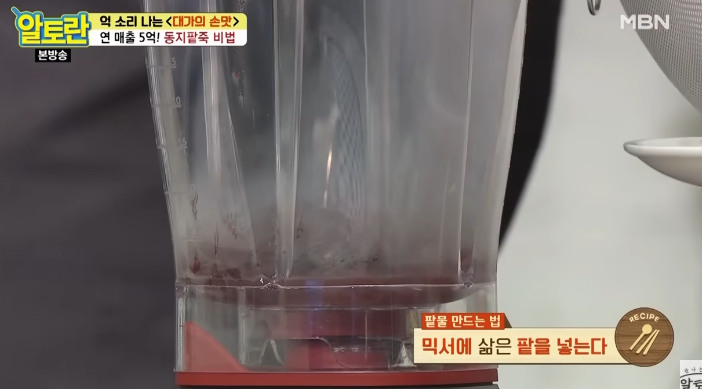 삶은 팥을 한김 식힌 후 물 4컵과 함께 믹서기에 넣고 곱게 갈아줍니다. 이때 팥껍질까지 함께 갈면 팥의 영양을 온전히 섭취할 수 있어 더욱 건강한 알토란 김하진 동지팥죽이 완성됩니다. 믹서로 갈아낸 팥물은 체에 한번 걸러 농도를 조절할 때 사용하고, 팥앙금은 따로 준비해 둡니다.
