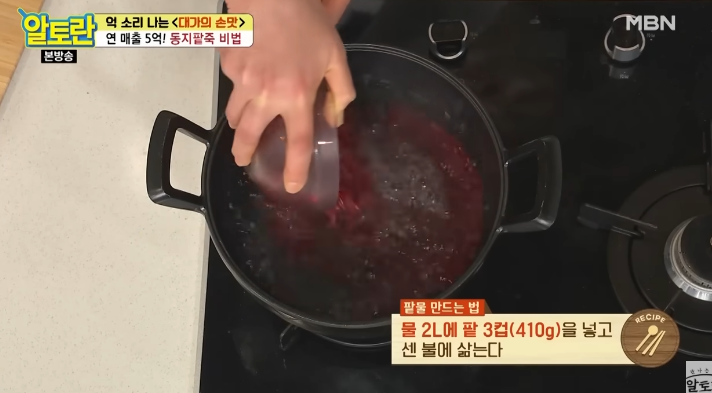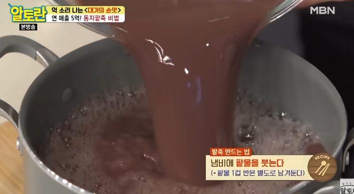 이후 팥앙금을 추가하여 농도를 맞추고 한소끔 끓이면 깊고 진한 맛의 알토란 김하진 동지팥죽이 완성됩니다. 마지막으로 통팥을 약간 추가하여 씹히는 식감을 살려주세요.