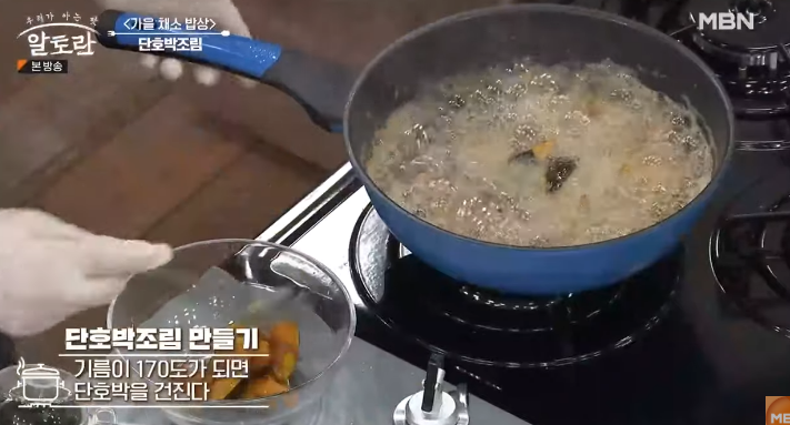 쪄낸 단호박에 준비한 양념장을 넣고 약한 불에서 조림을 시작합니다. 양념이 단호박 속까지 스며들도록 천천히 졸여주세요. 물기가 점점 줄어들면서 단호박 표면이 윤기 나기 시작하면 볶아둔 견과류를 넣고 골고루 섞어줍니다. 마지막으로 불을 끄고 참기름을 한두 방울 떨어뜨려 향을 더해주면 알토란 단호박조림 완성입니다.