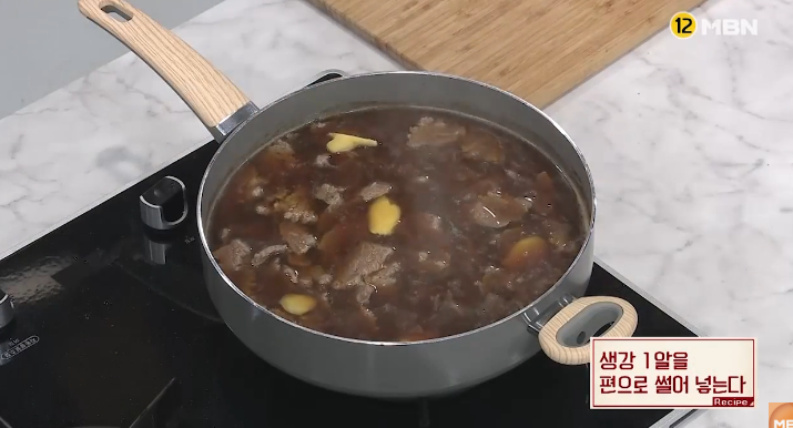 냄비에 물 2.4L를 붓고 끓이기 시작합니다. 물이 끓으면 소주 1/2컵을 넣고 핏물을 제거한 소고기를 함께 넣습니다. 뚜껑을 열고 센 불에서 10분 동안 데쳐 주세요. 이후 고기를 꺼내 찬물로 깨끗하게 헹궈 불순물을 완벽히 제거합니다.