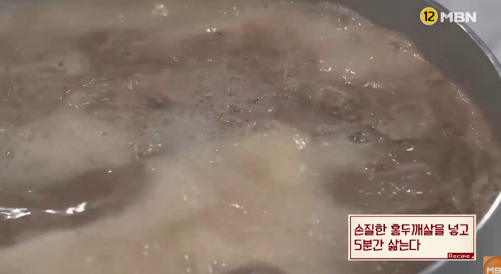 냄비에 물 2.4L를 붓고 끓이기 시작합니다. 물이 끓으면 소주 1/2컵을 넣고 핏물을 제거한 소고기를 함께 넣습니다. 뚜껑을 열고 센 불에서 10분 동안 데쳐 주세요. 이후 고기를 꺼내 찬물로 깨끗하게 헹궈 불순물을 완벽히 제거합니다.