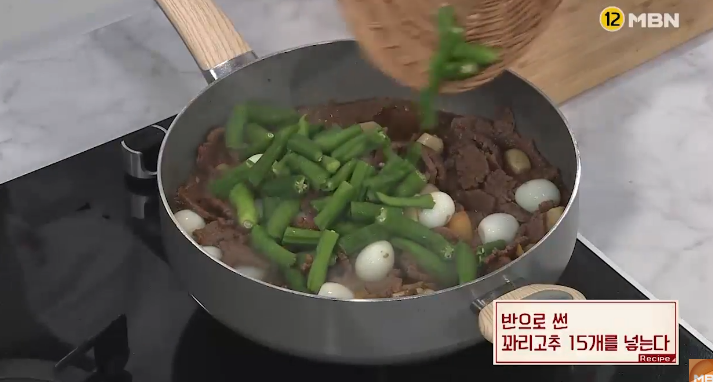 손질해 놓은 꽈리고추와 삶은 메추리알을 넣고 뚜껑을 열어 10분 정도 더 끓여주세요. 마지막으로 참기름 2큰술을 넣고 전체를 가볍게 섞어주면 윤기 나는 알토란 소고기 장조림이 완성됩니다.