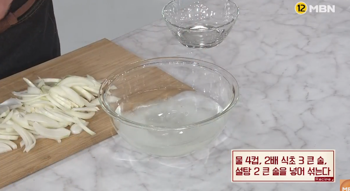 양파는 알토란 양파미역무침의 핵심 재료 중 하나로, 아삭한 식감을 살리는 동시에 매운맛을 줄여야 합니다. 볼에 물 4컵, 2배 식초 3큰술, 설탕 2큰술을 넣고 잘 섞은 후, 채 썬 양파를 10분간 담가두세요. 이후 체에 밭쳐 물기를 빼면 양파 특유의 자극적인 맛이 줄어듭니다.