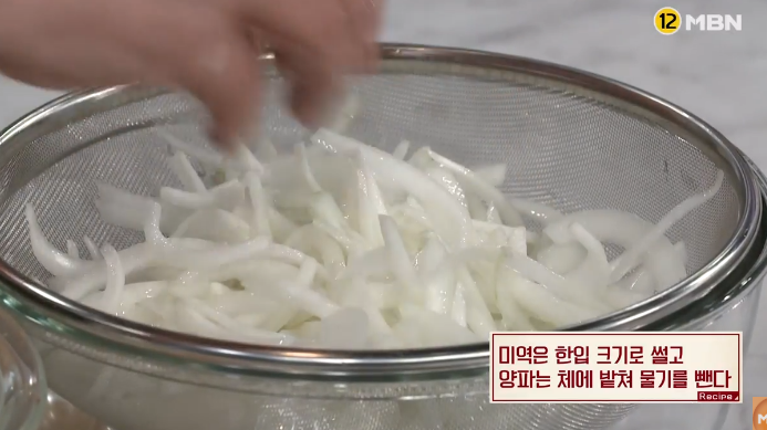 말린 미역은 찬물에 약 5분간 담가두면 충분히 불어납니다. 이때 너무 오래 두면 식감이 물러지므로 시간을 꼭 지켜야 합니다. 불린 미역은 체에 밭쳐 물기를 제거한 뒤, 손으로 꼭 짜서 준비합니다. 알토란 양파미역무침에서 미역은 꼬들꼬들한 식감을 담당합니다.