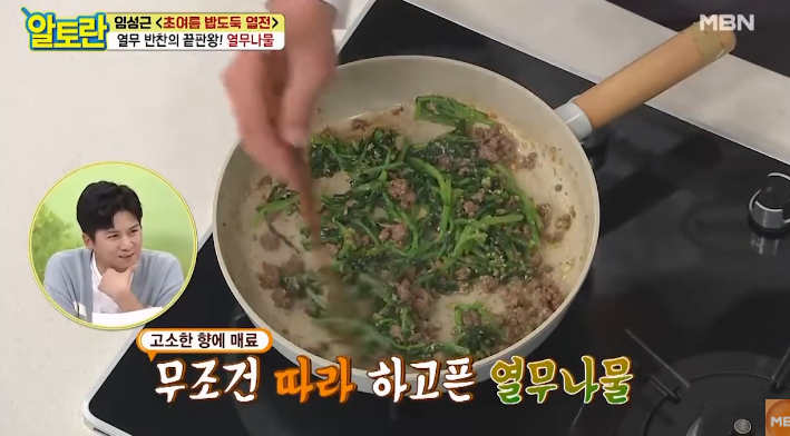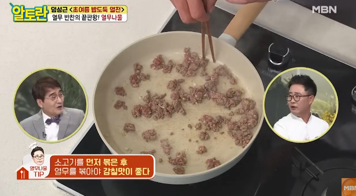 달군 팬에 들기름을 두르고 밑간한 소고기를 센 불에서 볶아줍니다. 소고기의 핏기가 사라질 때까지 충분히 볶은 후, 양념해둔 열무를 넣고 2분 정도 더 볶아주세요. 너무 오래 볶으면 열무가 질겨질 수 있으니 주의하시고, 마지막에 통깨를 뿌려 마무리합니다. 이렇게 완성된 알토란 열무나물 쇠고기볶음은 고소하면서도 상큼한 맛이 조화롭습니다.