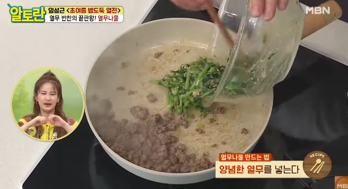 달군 팬에 들기름을 두르고 밑간한 소고기를 센 불에서 볶아줍니다. 소고기의 핏기가 사라질 때까지 충분히 볶은 후, 양념해둔 열무를 넣고 2분 정도 더 볶아주세요. 너무 오래 볶으면 열무가 질겨질 수 있으니 주의하시고, 마지막에 통깨를 뿌려 마무리합니다. 이렇게 완성된 알토란 열무나물 쇠고기볶음은 고소하면서도 상큼한 맛이 조화롭습니다.