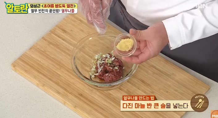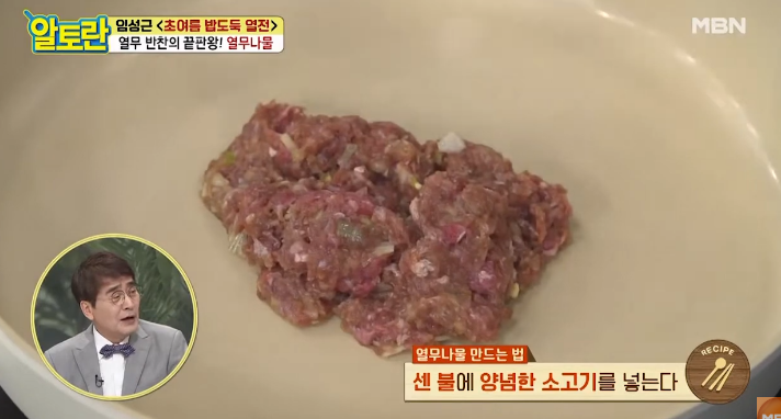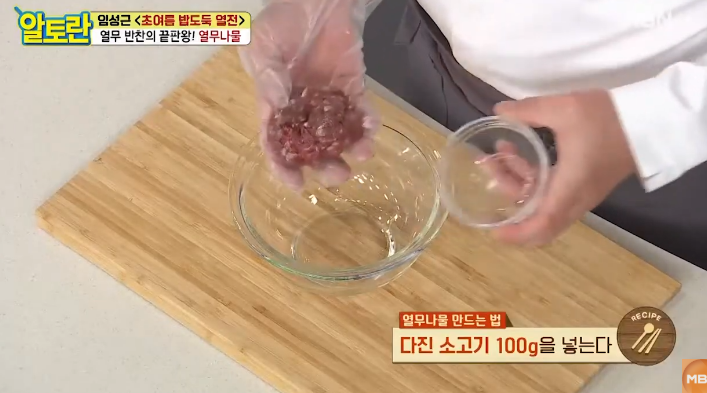 다진 소고기는 잡내를 없애고 깊은 맛을 내기 위해 간장, 다진 마늘, 다진 파, 들기름을 넣고 골고루 버무려주세요. 이 상태로 약 5분간 재워두면 고기에 양념이 잘 배어 더욱 풍미가 살아납니다. 알토란 열무나물 쇠고기볶음에서는 소고기의 감칠맛이 중요한 포인트이므로, 재우는 시간을 꼭 지켜주세요.