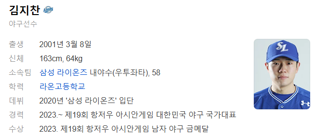 김지찬 선수는 2001년 3월 8일, 미국 아이오와 주에서 태어난 삼성 라이온즈의 우투좌타 내야수이자 외야수입니다. 현재 만 23세로, 주 포지션은 2루수와 중견수입니다. 키 163cm에 몸무게는 64kg로, KBO 리그 내에서 가장 작은 체구를 가지고 있지만 뛰어난 운동 신경과 탁월한 타격 능력으로 리그에서 두각을 나타내고 있습니다.