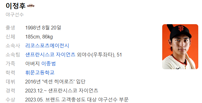 이정후는 1998년 8월 20일 일본 아이치현 나고야시에서 태어난 대한민국의 야구 선수로, 샌프란시스코 자이언츠에서 외야수(중견수)로 활약하고 있습니다.