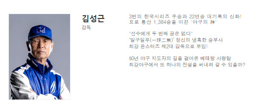 김성근 감독은 현재 JTBC의 인기 프로그램인 ‘최강야구’에서 ‘최강 몬스터즈’의 감독으로 출연 중입니다.