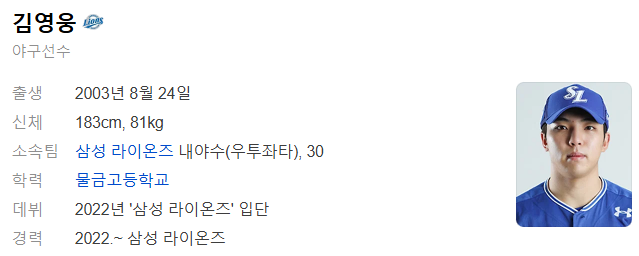 김영웅 선수는 2003년생으로, 현재 20세이며 충청남도 공주시에서 출신입니다. 야로중학교와 물금고등학교를 졸업했으며, 2022년 드래프트에서 삼성 라이온즈에 2차 1라운드로 지명되었습니다.