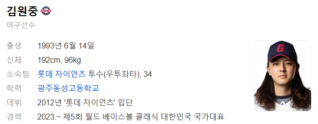 김원중 선수는 1993년 6월 14일 광주광역시에서 태어나 롯데 자이언츠에서 마무리 투수를 맡고 있는 우투좌타의 선수입니다. 192cm의 큰 키와 96kg의 체격을 지닌 그는 뛰어난 신체 조건을 바탕으로 안정적인 피칭을 선보이고 있습니다.