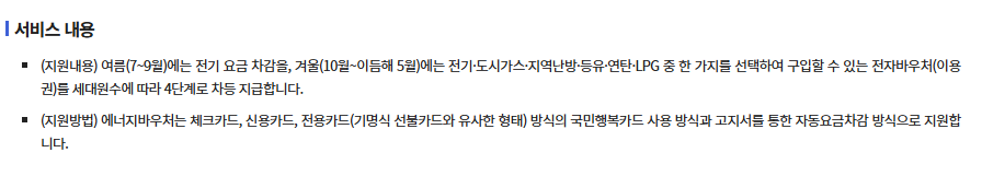 에너지 바우처는 저소득층을 대상으로 전기, 도시가스, LPG, 등유, 연탄 등의 에너지 사용을 지원하는 제도입니다. 여름에는 냉방비, 겨울에는 난방비를 절감할 수 있도록 지원하며, 가정 경제에 큰 도움이 됩니다. 이를 통해 지원 가구는 경제적 부담을 줄이고 쾌적한 환경에서 생활할 수 있습니다.