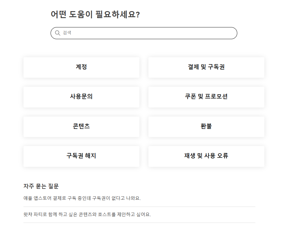 왓챠는 자주 발생하는 문제를 빠르게 해결할 수 있도록 FAQ 섹션을 제공합니다. 자주 묻는 질문과 답변이 주제별로 정리되어 있으므로 간단한 문제는 스스로 해결할 수 있습니다.