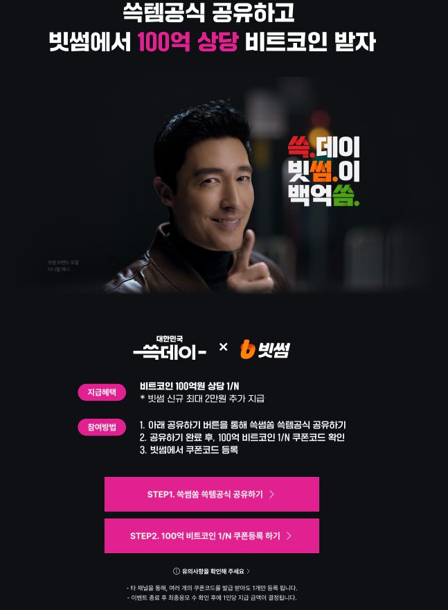 쓱데이 마지막 날인 11월 10일까지 행사 일정과 혜택을 공유하는 고객 중 추첨을 통해 총 100억 원 상당의 비트코인을 지급하는 특별 이벤트도 마련되어 있습니다.