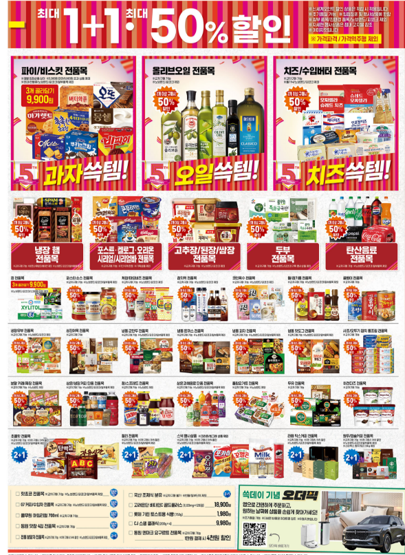 샴푸, 바디워시, 치약, 칫솔 등 생필품을 최대 50% 할인된 가격에 제공하며, 1+1 행사와 2개 구매 시 할인 혜택까지 함께 누리실 수 있습니다. 실용적이고 경제적인 쇼핑을 위한 기회입니다.