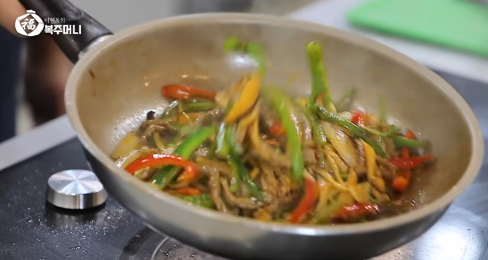 고기가 거의 익었을 때 채썰어둔 고추와 양파를 넣어 함께 볶습니다. 센 불에서 재빨리 볶아야 고추의 아삭한 식감이 유지됩니다. 양파가 반투명해질 정도까지만 볶아주세요.