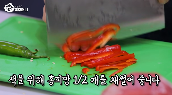 아삭이고추는 반을 가른 뒤 씨를 제거하고 곱게 채썰어 줍니다. 이 과정을 통해 고추 특유의 텁텁한 맛은 제거되고, 깔끔하고 아삭한 식감이 살아납니다. 가능한 한 얇고 균일하게 썰어주는 것이 포인트입니다.