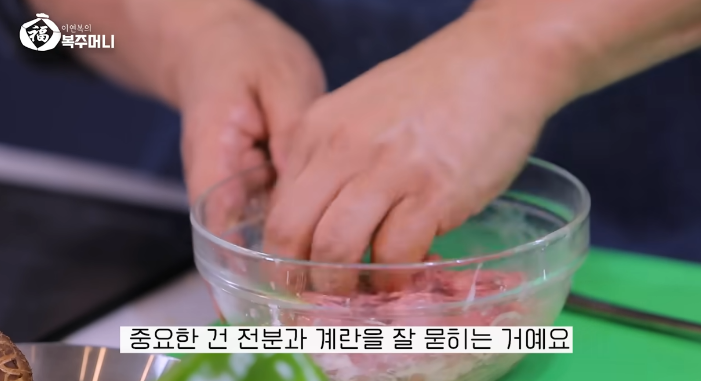 잡채용 돼지고기에 전분가루와 달걀흰자를 넣고 고루 섞어줍니다. 이 과정을 통해 고기가 볶을 때 수분을 유지하며 더욱 부드러운 질감을 갖게 됩니다. 고루 묻혀진 전분은 양념과도 잘 어우러집니다.