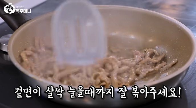 파기름을 만든 팬에 전분옷을 입힌 돼지고기를 넣고 볶아주세요. 이때 청주를 소량 넣으면 돼지고기 특유의 잡내가 사라지고 더욱 담백한 맛을 낼 수 있습니다. 고기가 너무 오래 익지 않도록 중불에서 볶는 것이 좋습니다.