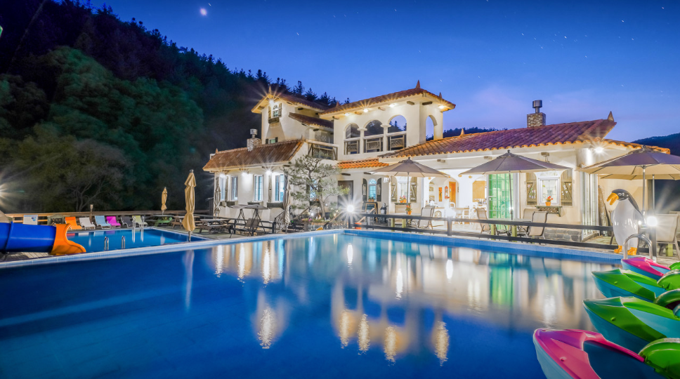 글램핑장에는 독채 풀빌라와 글램핑 텐트가 구비되어 있으며, 풀빌라는 최대 16명까지 수용 가능한 넓은 공간을 제공합니다. 글램핑 텐트는 편안한 침대와 조리 시설, 개별 화장실 등이 마련되어 있어 쾌적한 캠핑이 가능합니다.