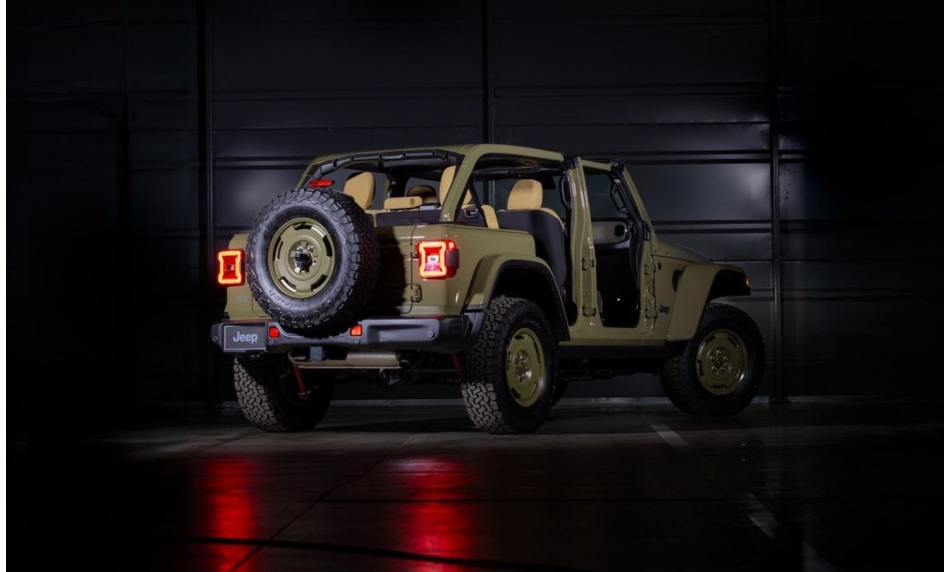 보닛에는 스텐실 스타일로 새겨진 “WILLYS / 4XE” 데칼과 “‘41” 로고가 자리하고 있으며, 후미등 아래에는 파란색 “4XE” 데칼이 특별판의 정체성을 강조합니다.