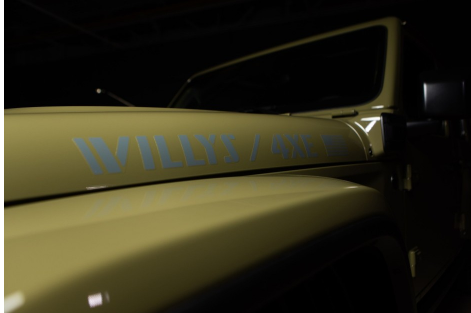 보닛에는 스텐실 스타일로 새겨진 “WILLYS / 4XE” 데칼과 “‘41” 로고가 자리하고 있으며, 후미등 아래에는 파란색 “4XE” 데칼이 특별판의 정체성을 강조합니다.
