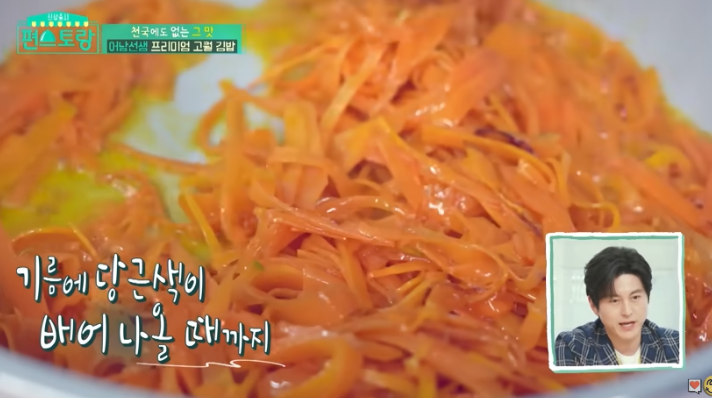 남선김밥의 가장 큰 특징은 바로 '당근기름'입니다. 이 기름은 각종 재료에 풍부한 감칠맛을 더해주는 비밀 병기입니다. 먼저 당근을 채칼로 곱게 채 썰어주세요. 이후 팬에 아보카도오일을 넉넉히 두르고 당근을 중불에서 볶아줍니다. 색이 선명해지고 수분이 날아들면 체에 밭쳐 기름과 건더기를 분리해줍니다. 이때 나온 당근기름은 이후 요리 전반에 활용됩니다.