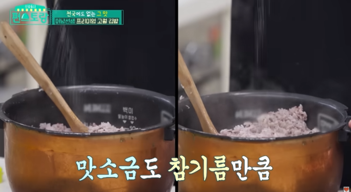 밥은 김밥의 중심입니다. 밥을 지을 때는 맛다시마 1장을 넣어 감칠맛을 더해주고, 물은 평소보다 10% 적게 넣어 밥알이 퍼지지 않게 조절합니다. 완성된 밥에는 볶은 천일염 4꼬집과 참기름 20ml를 넣고, 퍼지지 않도록 날을 세워 부드럽게 섞어줍니다. 이 과정에서 섞는 손놀림도 중요하므로 밥알이 뭉개지지 않게 주의해 주세요.