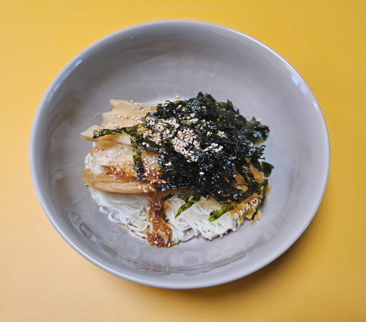면 위에 길게 찢은 묵은지를 올리고, 그 위에 잘 섞은 양념장을 듬뿍 얹습니다. 기호에 따라 김가루와 통깨 또는 깨소금을 뿌려 마무리하면 보기에도 먹음직스럽고 맛도 좋은 ‘어남선생 류수영’ 스타일 간장비빔국수가 완성됩니다. 묵은지와 함께 비벼가며 한입 가득 즐겨보세요.