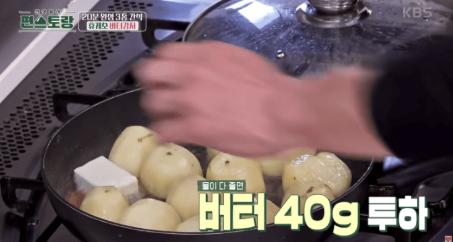 물이 완전히 증발한 후에는 불을 중약불로 줄이고, 준비한 버터를 넣어 감자에 골고루 코팅되도록 천천히 굴려줍니다. 이때 감자가 으깨지지 않도록 주걱을 사용하거나 팬을 살짝 흔드는 방식으로 조심스럽게 버터를 스며들게 합니다. 이 과정에서 ‘류수영 버터통감자’ 특유의 고소한 풍미가 살아납니다.