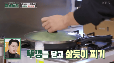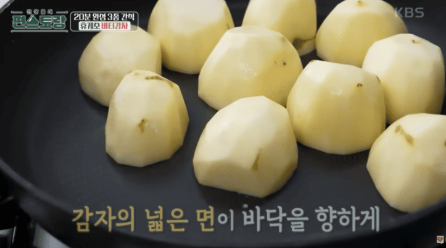 넓은 팬에 물 한 컵을 넣고 썰어 놓은 감자를 바닥이 넓은 면이 아래로 가도록 차곡차곡 배열합니다. 중불에서 물이 끓기 시작하면 소금을 넣고 뚜껑을 덮은 후, 중불을 유지하며 감자를 찌듯이 익혀줍니다. 물이 점차 줄어들며 감자가 익기 때문에 중간중간 팬을 살짝 흔들어 감자가 골고루 익도록 도와줍니다.