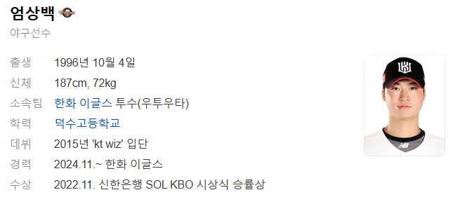 2024.11.08 - [인물 백과] - 야구 선수 엄삼백 프로필 / 나이 / 키 / 연봉 / 한화 이글스 / FA 계약