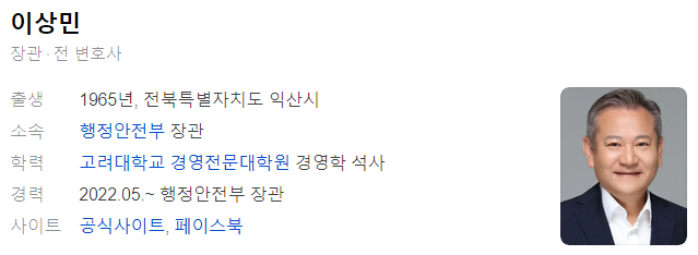 2022년 10월 발생한 이태원 참사 이후, 이상민 장관은 사건 대응 책임자로서 많은 비판을 받았습니다. 야당은 해임을 요구했으나 대통령이 이를 수용하지 않았고, 이후 탄핵소추안이 헌법재판소에서 기각되며 장관직을 유지하게 되었습니다.