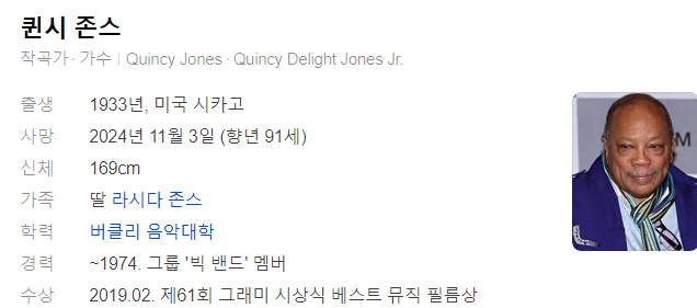 세계적인 음악 프로듀서이자 작곡가, 그리고 영화·TV 프로그램 제작자였던 퀸시 존스가 2024년 11월 4일 향년 91세로 별세하였습니다. 그는 수십 년에 걸쳐 음악과 미디어 업계에 지대한 영향을 미치며 '팝의 거장'으로 불렸으며, 그가 남긴 유산은 지금도 이어지고 있습니다.