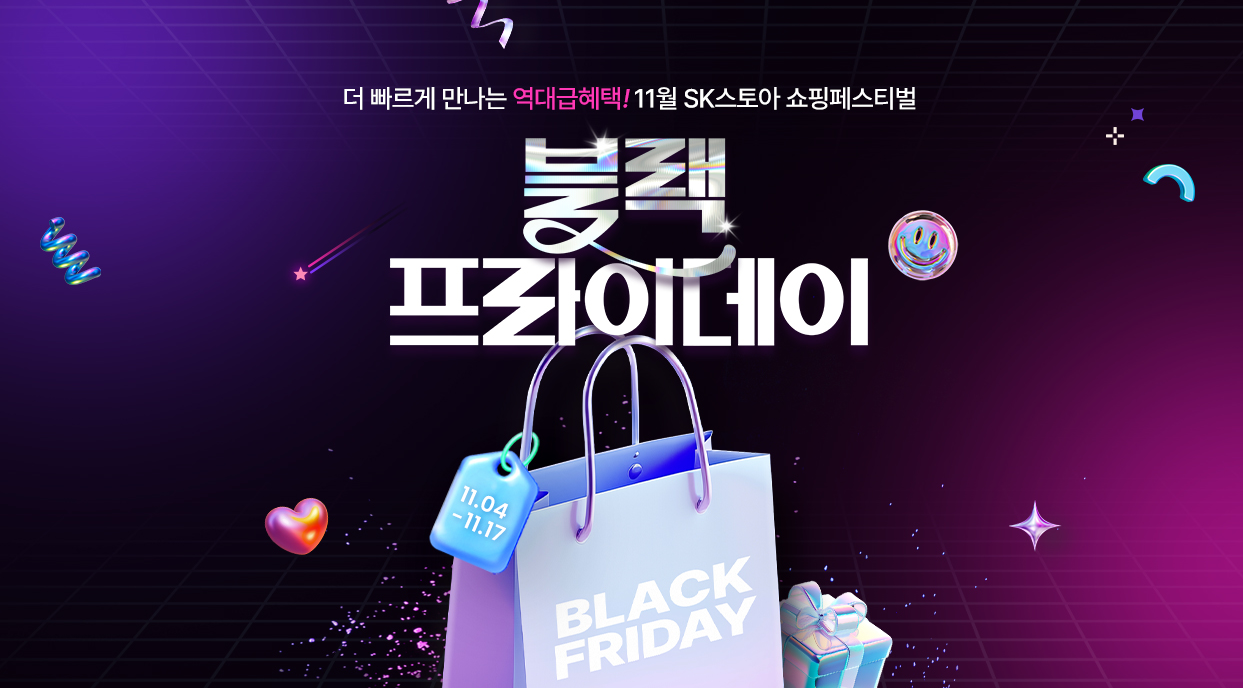 11월 쇼핑 시즌을 맞아 SK스토아가 고객들에게 특별한 쇼핑 혜택을 제공하는 ‘블랙 프라이데이’ 행사를 시작합니다. 다양한 브랜드의 할인과 풍성한 경품 행사를 통해 SK스토아가 준비한 혜택을 놓치지 마세요!