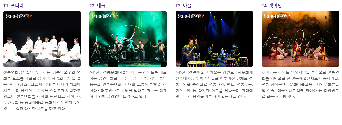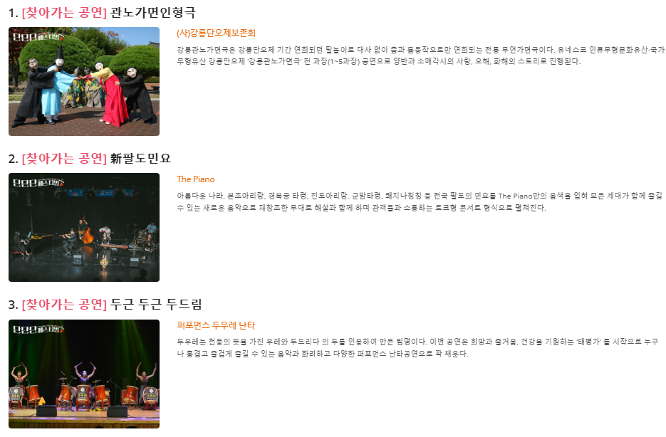 - 전통 무용 공연 : 한국의 전통 무용과 현대 무용을 조화롭게 구성하여 특별한 공연을 선사합니다.