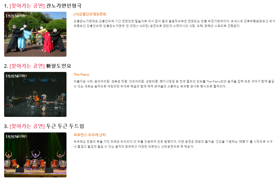 - 전통 무용 공연 : 한국의 전통 무용과 현대 무용을 조화롭게 구성하여 특별한 공연을 선사합니다.