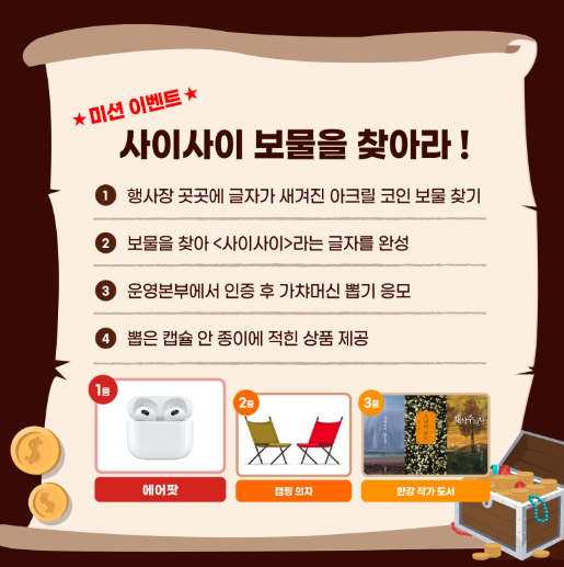행사장 곳곳에 숨겨진 글자가 새겨진 아크릴 코인을 찾는 미션입니다. 글자를 완성하여 인증을 마치면 경품 추첨에 참여할 수 있으며, 에어팟, 캠핑 의자, 인기 작가 한강의 도서 등 다양한 경품이 준비되어 있습니다. 모든 연령대가 함께 즐길 수 있는 흥미로운 이벤트입니다.