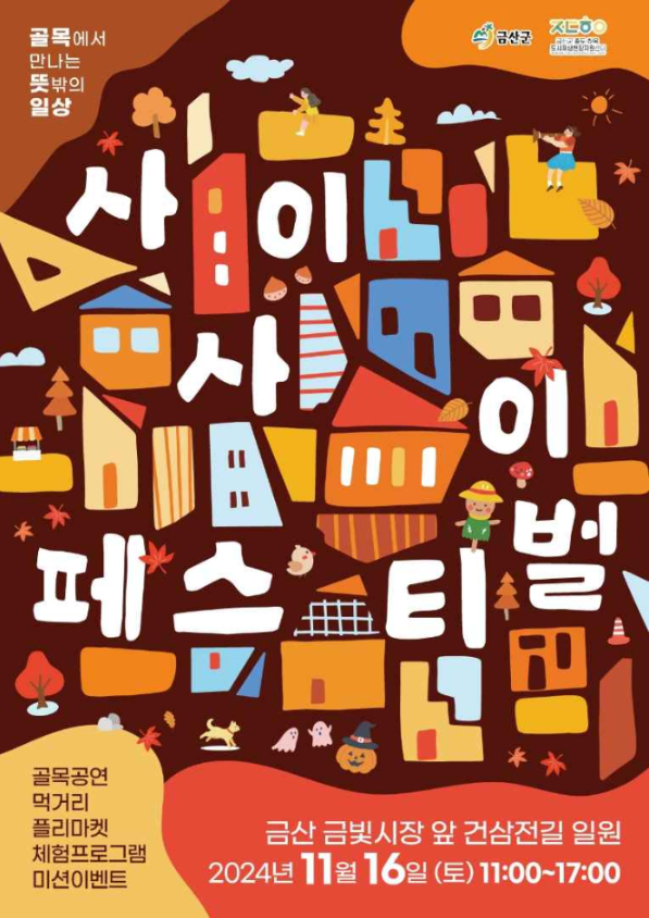 안녕하세요, 대전 근교에서 즐길 수 있는 특별한 가을 축제, '사이사이 페스티벌'을 소개합니다. 충청남도 금산군에서 열리는 사이사이 페스티벌은 다양한 예술과 문화를 체험하며 지역의 매력을 만끽할 수 있는 행사입니다. 이 축제는 금산군의 건삼전길과 금빛시장 일대에서 개최되며, 주민과 방문객들이 함께 어우러지는 특별한 시간이 될 것입니다. 아래에서 축제의 상세 일정과 추천 장소들을 소개해드리겠습니다.