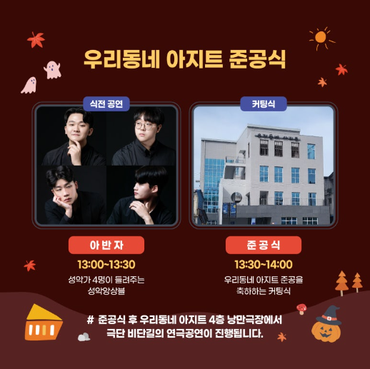 이번 축제에서는 금산 주민들이 사랑하는 공간, '우리 동네 아지트'의 준공식을 함께합니다. 식전 공연으로 성악 앙상블이 준비되어 있으며, 성악가 4명이 들려주는 아름다운 하모니를 감상할 수 있습니다. 이어지는 준공식과 커팅식에서는 새로운 공간의 시작을 축하하며 연극 공연도 진행될 예정입니다.
