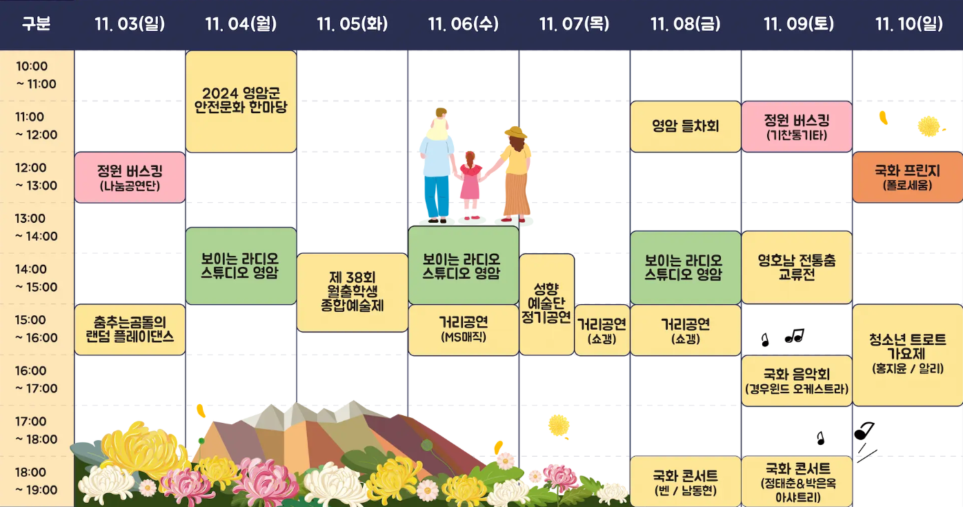 축제 기간 동안 국화콘서트와 함께 춤추는 곰돌 랜덤플레이댄스, 청소년 트로트 가요제 등 다양한 이벤트가 마련되어 있습니다. 특히 개막식 국화콘서트는 많은 이들의 이목을 끌고 있으며, 주요 프로그램 시간표는 다음과 같습니다.