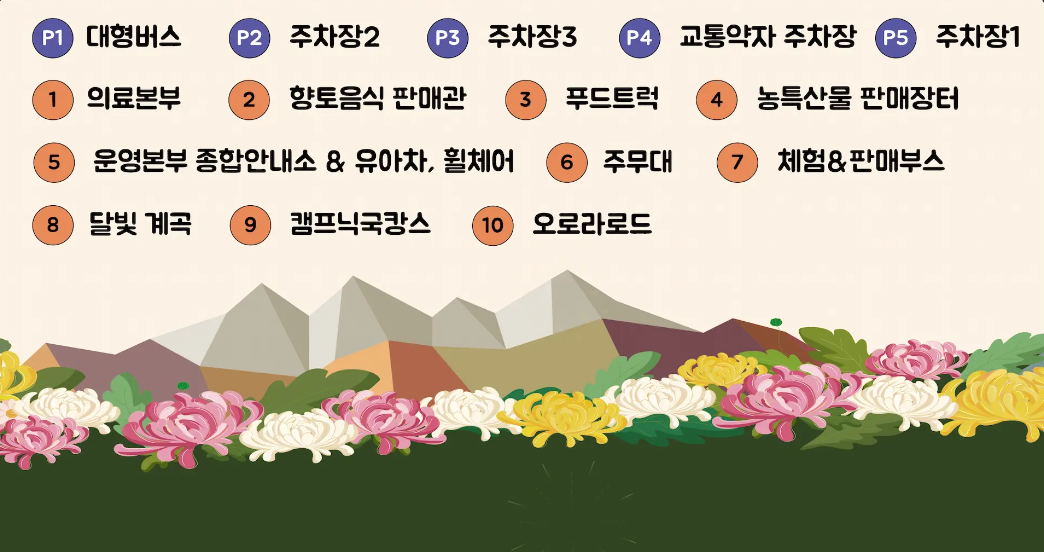 이번 축제에서는 국화 작품 전시뿐만 아니라 다양한 문화 체험과 특별한 볼거리가 준비되어 있습니다. 관광 홍보를 위한 체험 부스와 함께 국화꽃이 만개한 현장에서 가을의 정취를 느껴보세요. 또한, 축제 기간 동안 다양한 초대 가수들이 무대를 장식하여 방문객들에게 특별한 감동을 선사할 예정입니다.