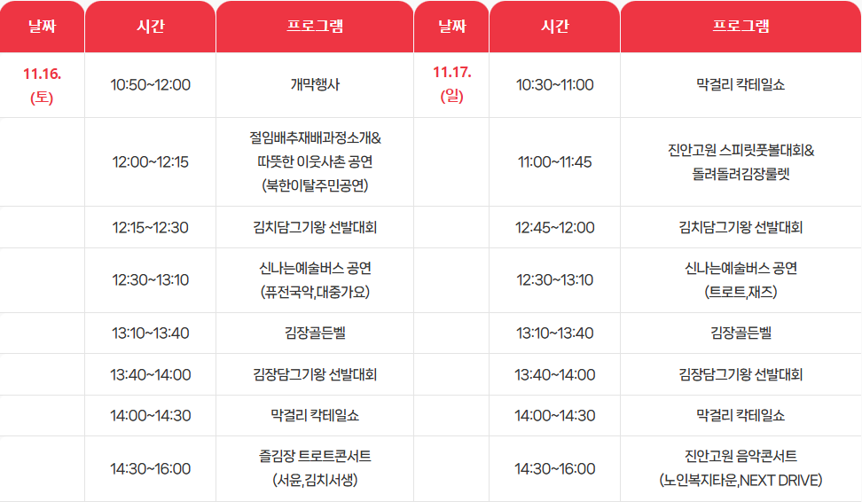 | 2024년 11월 축제 전북 완주 소양 미디어 아트 페스타 일정 / 장소 / 초대 가수 / 셔틀버스 / 사전예약하기 (0) | 2024.11.11 |