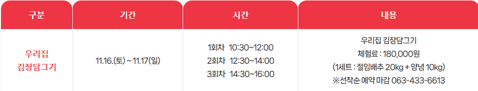 특히 김치 담그기 체험은 많은 인기를 끌고 있으므로, 참가를 원하시는 분들은 미리 예약을 고려하는 것이 좋습니다.