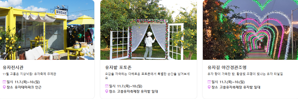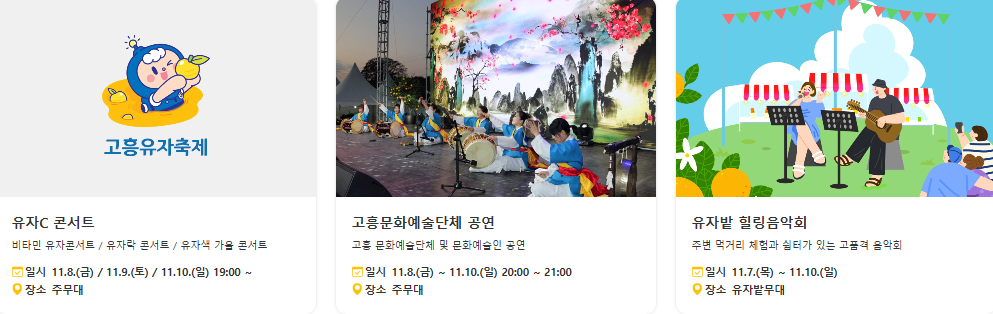 2024 고흥 유자축제는 오는 11월 7일부터 11월 10일까지 나흘간 전남 고흥군 풍양면 한동리에서 열리며, 다양한 유자 테마의 공연과 전시, 체험 프로그램을 통해 유자의 매력을 한껏 느낄 수 있는 기회가 마련됩니다.