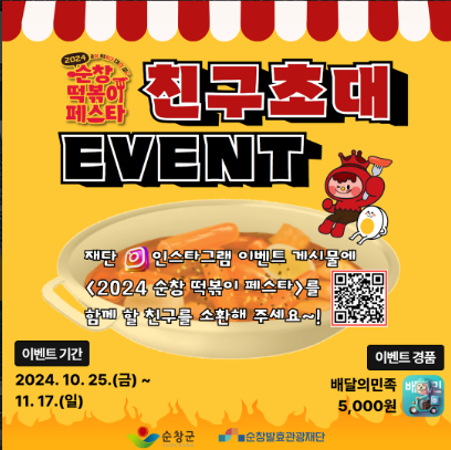 순창 떡볶이 페스타에서는 친구와 함께 축제를 방문하면 특별한 혜택을 받을 수 있는 ‘친구 초대 이벤트’가 진행됩니다. 친구와 함께 참여하여 할인 쿠폰 또는 기념품을 받는 즐거움을 누리세요. 이벤트는 순창발효관광재단 및 순창발효테마파크 인스타그램을 통해 참여할 수 있습니다.