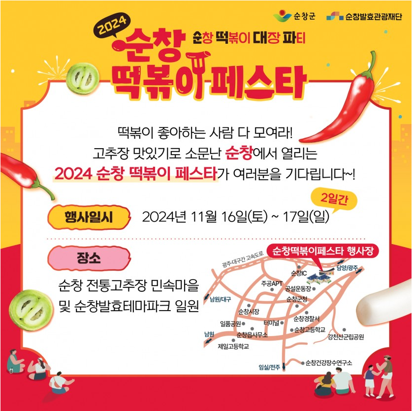 순창 떡볶이 페스타는 지역 주민과 관광객이 함께 모여 순창의 특산물인 고추장을 주재료로 한 다양한 떡볶이 요리를 즐기고, 순창의 전통문화를 경험하는 소중한 자리입니다. 매운맛과 다양한 재료로 인기를 끌고 있는 순창의 떡볶이를 마음껏 즐길 수 있는 이번 축제에 많은 관심과 참여 부탁드립니다!