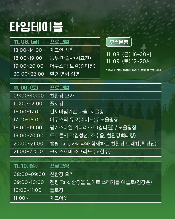 | 주요 프로그램 | 친환경 캠핑 체험, 공연 및 토크콘서트, 플로깅, 친환경 제품 부스 |